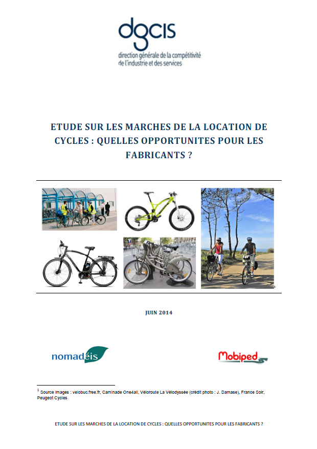 The French Ministry Economics wants to take advantage of the dynamics of the bicycle rental markets to stimulate the cycle industry. Thus, a complete market study of cycle markets (bike-sharing, tourist rental, long-term rental and bike availability) are studied in detail. The result is a comprehensive vision of these markets, an international benchmark, 5 challenges and 22 recommendations.Beneficiary(s)